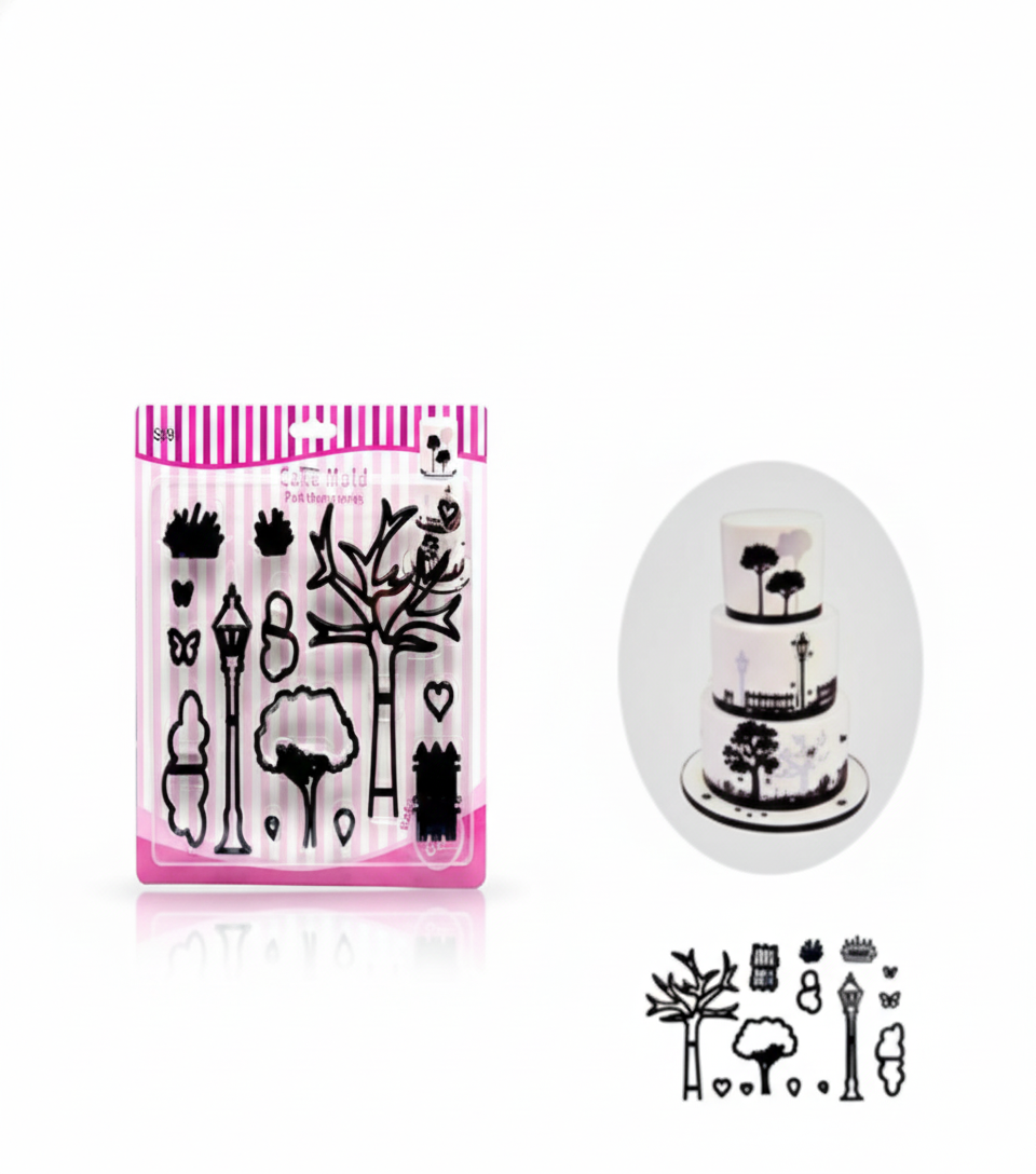 The product shown is a set of Park Theme Silhouette or Countryside Patchwork Cutters. It is identified by names such as “Kit Confeiteiro Decorador Arvores 8 Pçs Stock e Cia”.