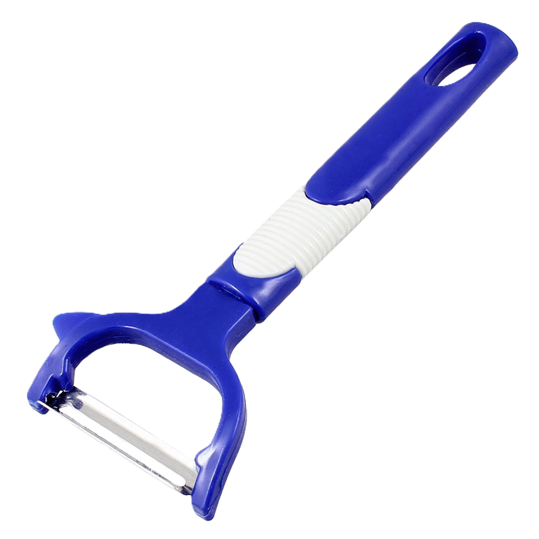 - Design and Appearance: It features a predominantly blue plastic handle with a white, textured, non-slip grip section for comfort and control. There is a hole at the end of the handle for hanging storage. The peeler has a wide, Y-shaped frame that holds a sharp, stainless steel swivel blade.