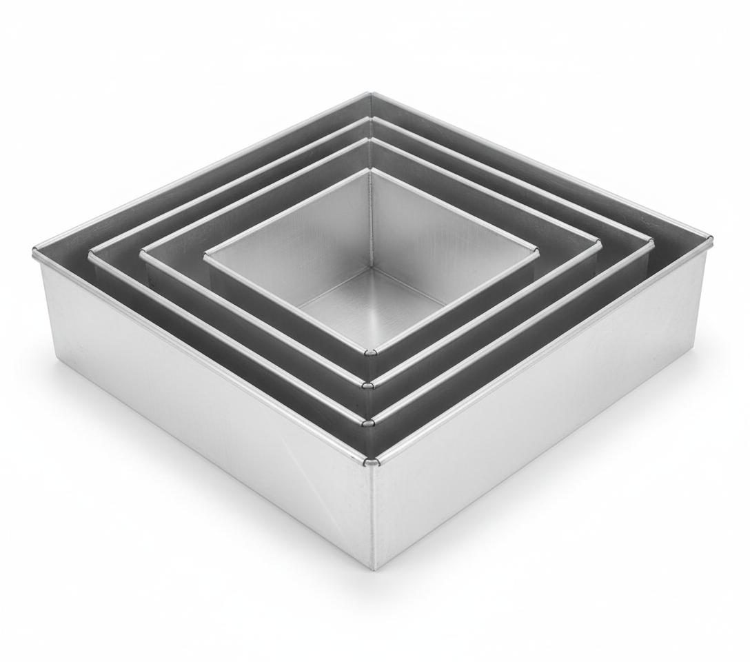 - Set Composition: The set contains four square cake pans with approximate sizes of 6-inch, 8-inch, 10-inch, and 12-inch.